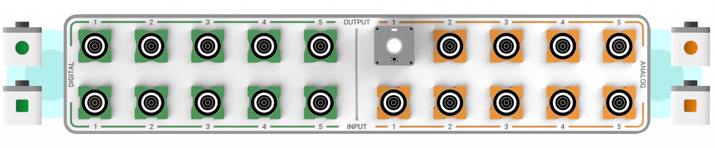 The breadboard serves as the interface between the computer system and the components that transmit information. In physical computing, information can be transferred in two ways: digital, which operates in binary (on or off), and analog, which provides a range of values between 0 and 1023. To differentiate these, green is used for digital signals and orange for analog signals, as shown on the breadboard below.