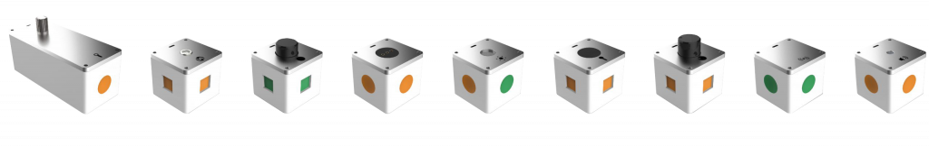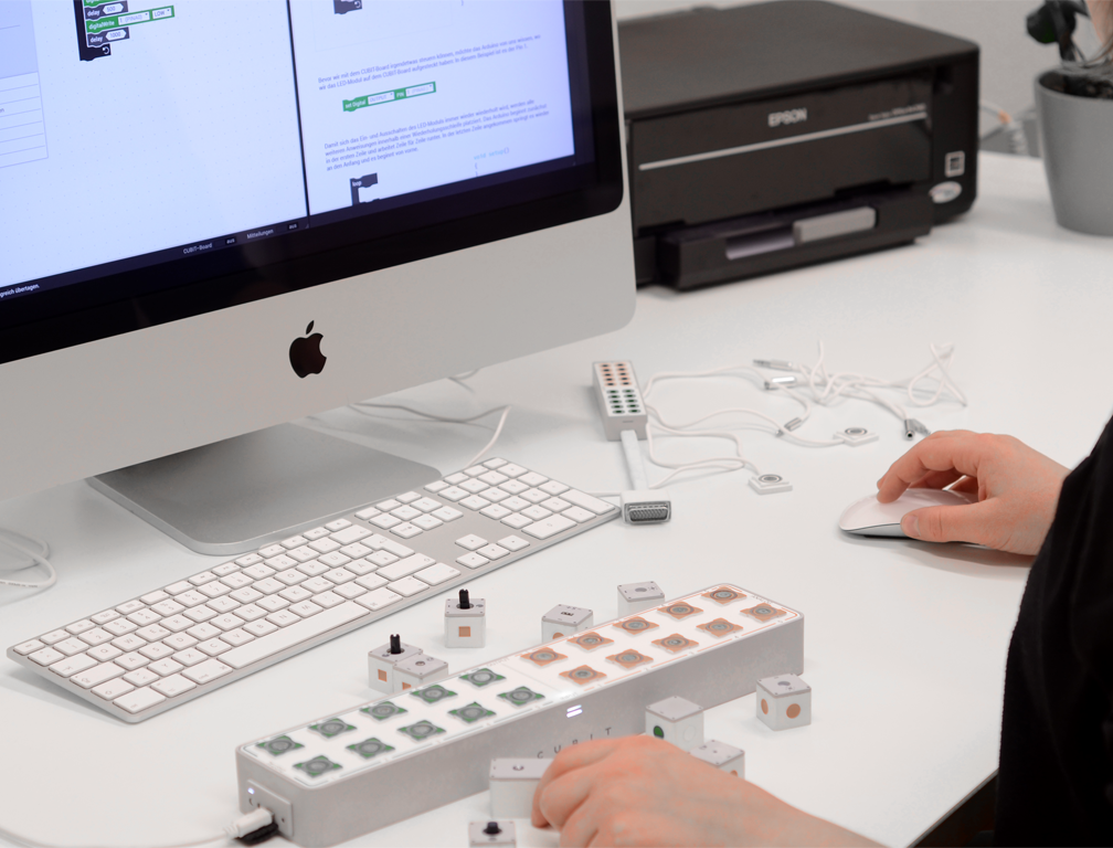 The input and output elements are designed as cubes, making them easy to connect by simply placing them onto the breadboard. Color and shape indicators ensure proper placement, while a built-in magnet system securely connects the elements. A three-point spring contact links the interface for seamless functionality. To confirm a successful connection, an LED light on top of the cube illuminates.