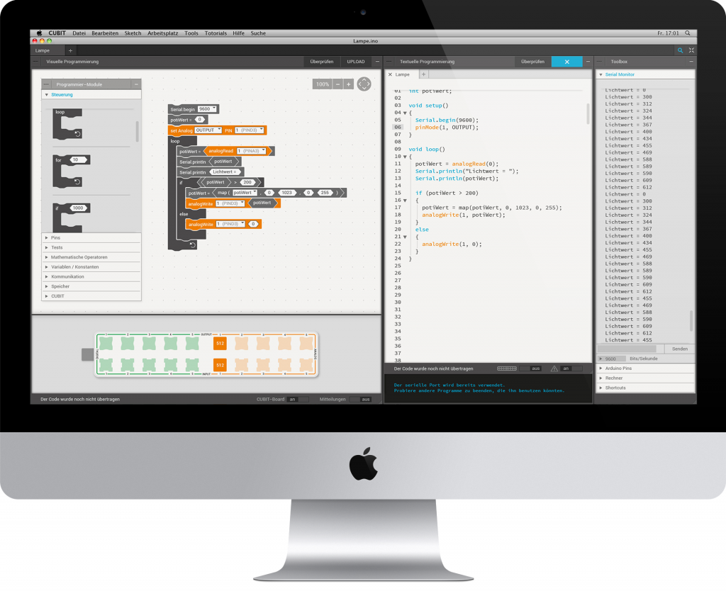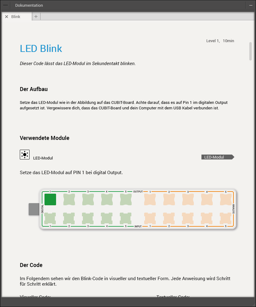 Below the visual coding window is a representation of the breadboard. This section mirrors the cubes placed on the physical breadboard, allowing users to verify correct placement. Color coding visually connects the elements in the hardware to their corresponding parts in the visual code, ensuring an intuitive overview.