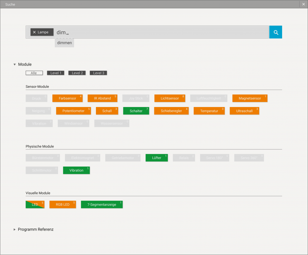 The search window allows users to easily search for modules and their features. By typing in a keyword or request, the software instantly provides suggestions for relevant modules and their possible combinations. This feature streamlines the process of finding the right components for a project, saving time and enhancing efficiency. To further assist with navigation, color coding is used to distinguish between analog and digital modules, making it clear at a glance which type of component you’re working with. Some cubes, like the LED module in the example, are versatile and can function as both analog and digital, showcasing their flexibility in various applications. This dynamic search and filter system empowers users to quickly identify the right modules and experiment with different configurations for their projects.