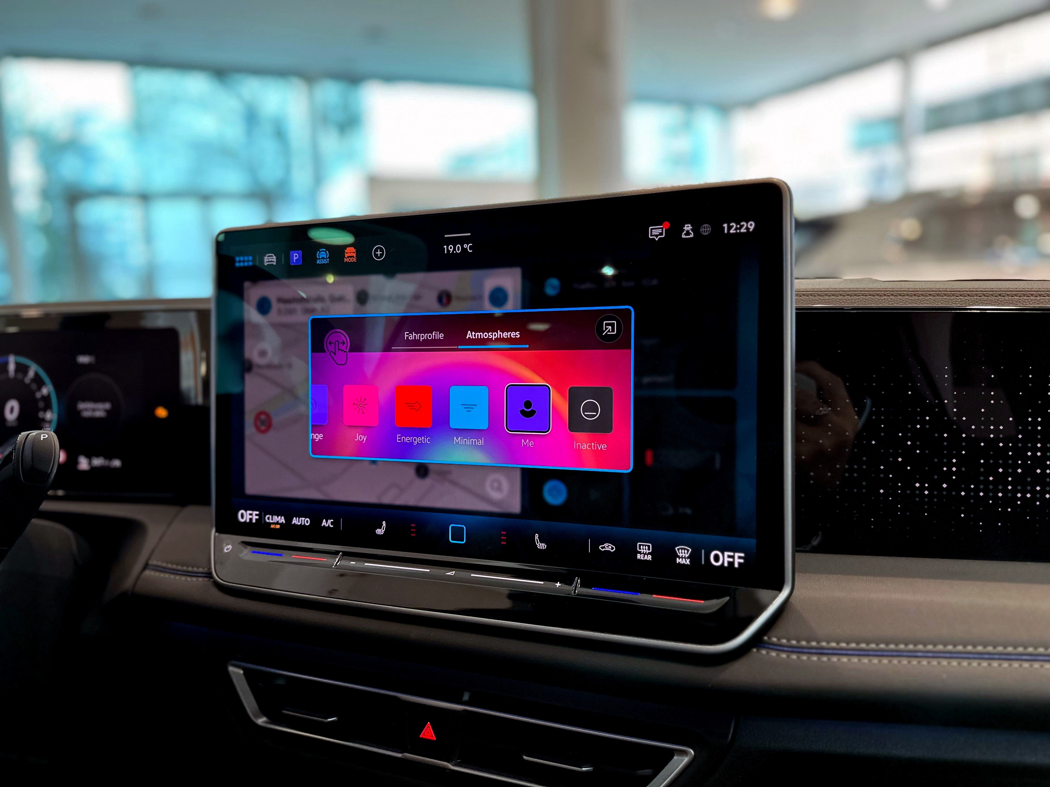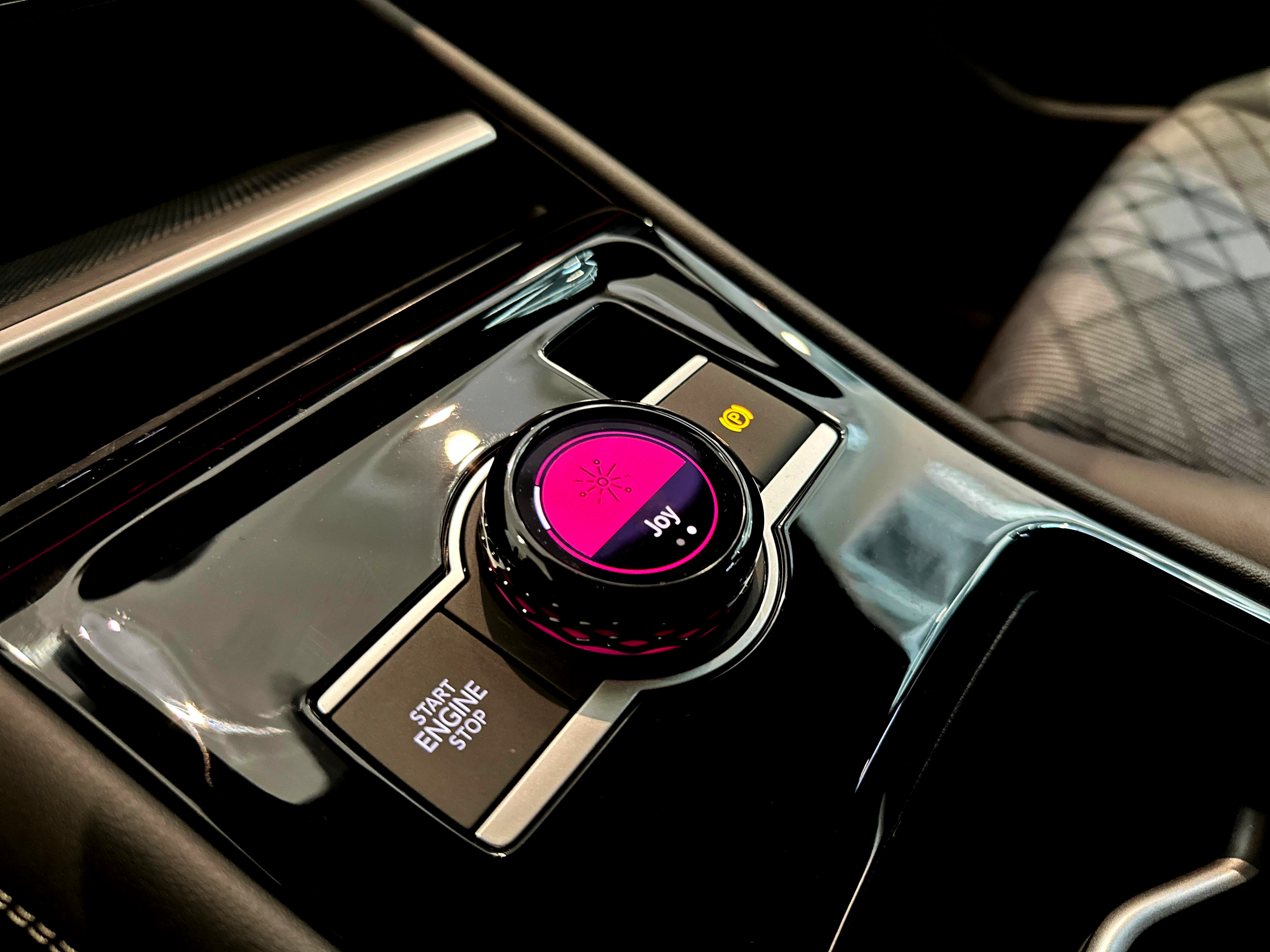 To switch between Atmospheres, the knob can be easily rotated. Each icon represents a unique Atmosphere, distinguished by a specific color reflected in the ambient lighting, cockpit display, and infotainment system. Additionally, a matching music playback and a digital cockpit visualization are included. The presets are fully customizable and users can create new custom options to suit their preferences. As mentioned earlier, the visualization on the rotary knob is mirrored on the infotainment screen to help avoid distraction by keeping critical information in the driver’s immediate line of sight, reducing the need to look away from the road while driving.