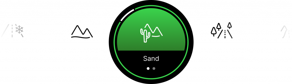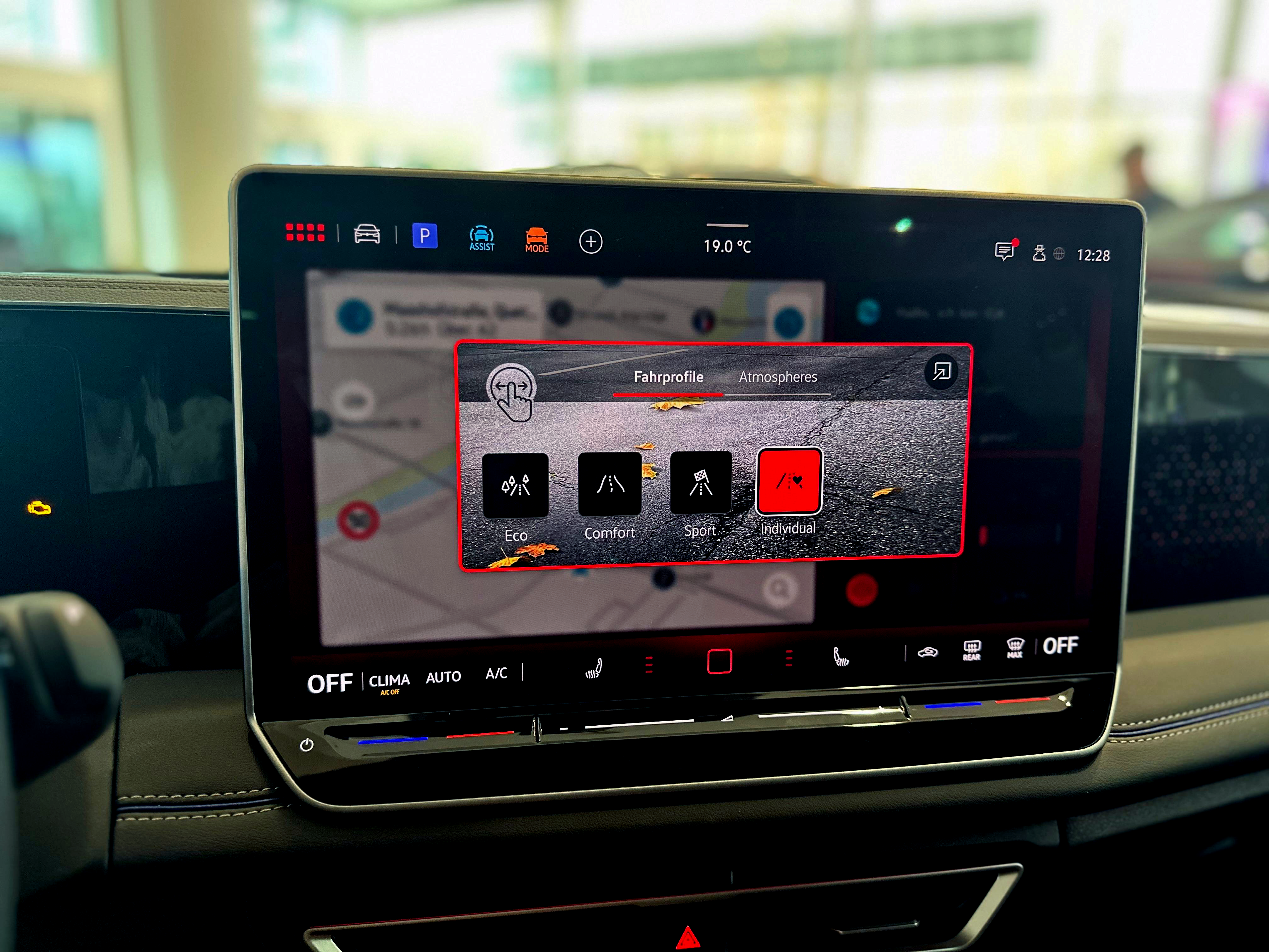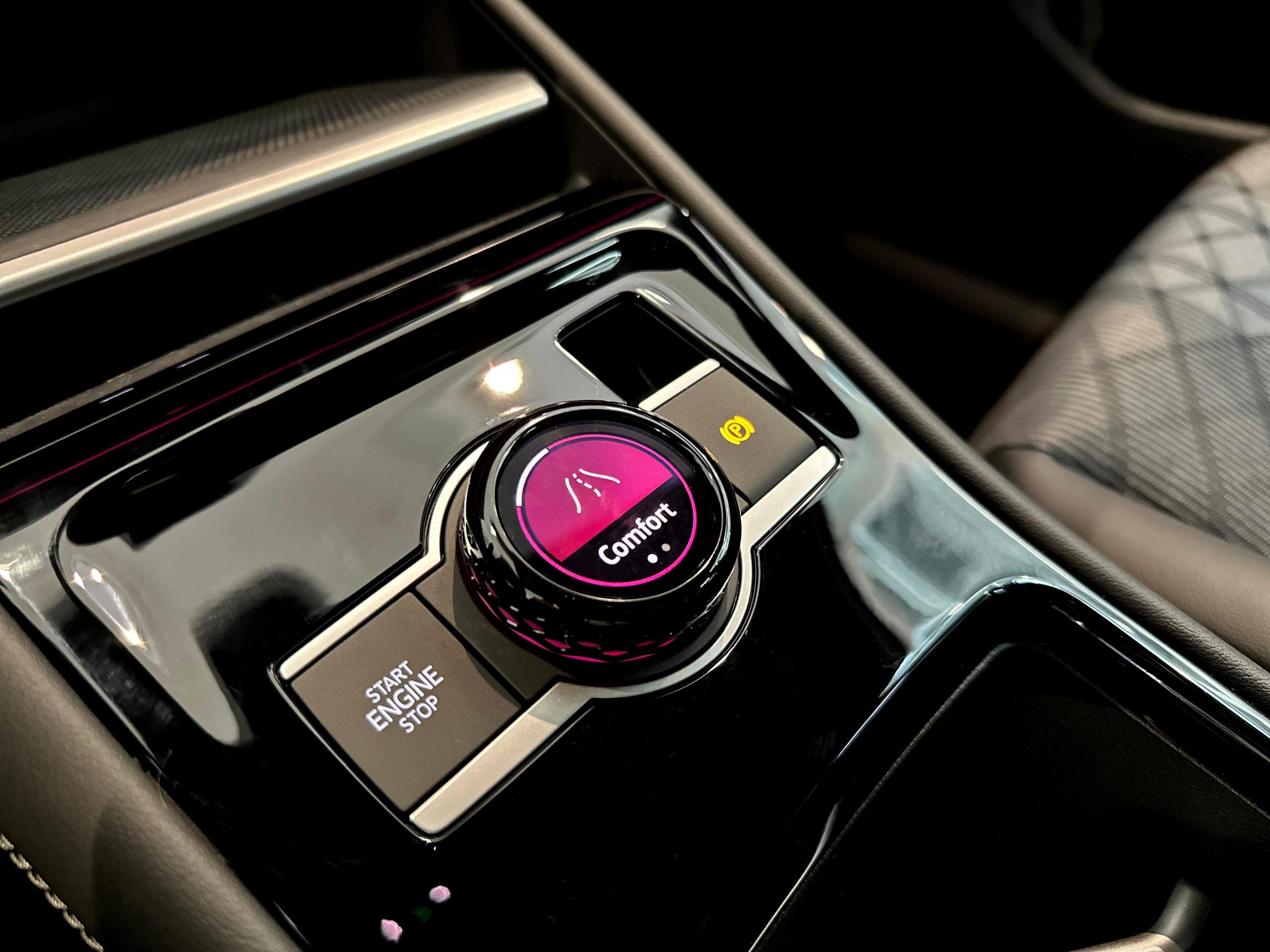 Last but not least, the Driving Profiles can be accessed with a swipe after pressing the button, assuming it was previously set to Atmospheres, as in our example. Similar to Atmospheres, rotating the knob will display the available profiles in the center of the display. Only the driving characteristics will be adjusted, while the Atmosphere remains unchanged.