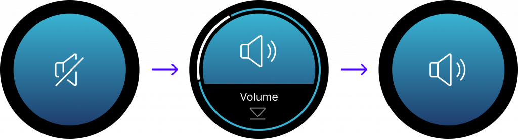 To adjust the volume, the knob can be effortlessly rotated. Turning the volume to its minimum automatically mutes the audio, with a corresponding symbol displayed on the screen. While rotating, a graphical circular indicator visually represents the volume level, and an icon appears, signaling the option to push the knob to switch to other modes.