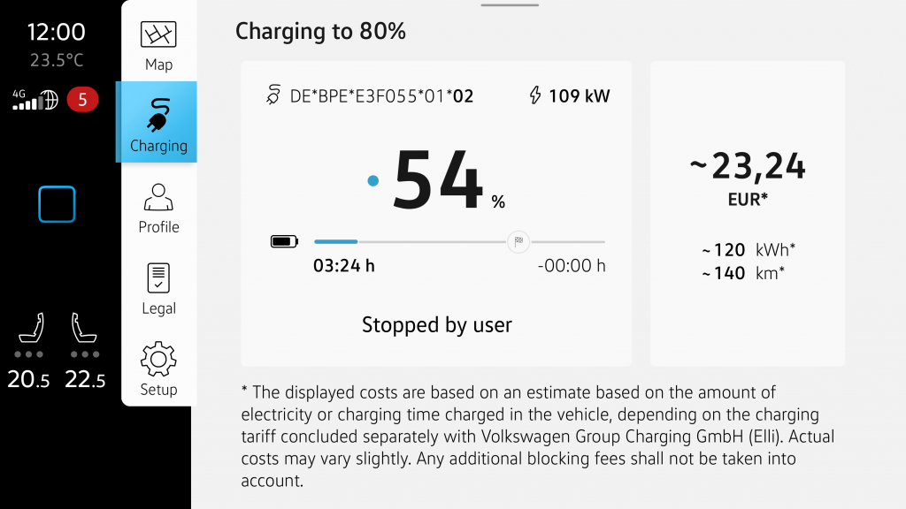 Here is the charging process view. It displays the charging power in kilowatts, the current battery level, the elapsed time, and the remaining time until the charging target is reached. Additionally, the approximate cost is calculated; the actual cost can only be determined after the completion of the charging process based on the charging power and duration.