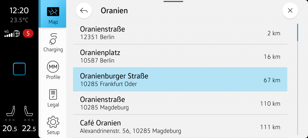 After selecting an entry in the list, the designated point on the map is highlighted. The surrounding charging stations are displayed on both the map and in a list. The handlebar allows for expanding the area of the charging station listing. Additional information, such as the maximum kilowatt capacity of the charging stations, as well as more details about the name and address of the charging station, becomes visible. Alternatively, one can enlarge the map view by sliding the handlebar to the right to get a better overview of the map.