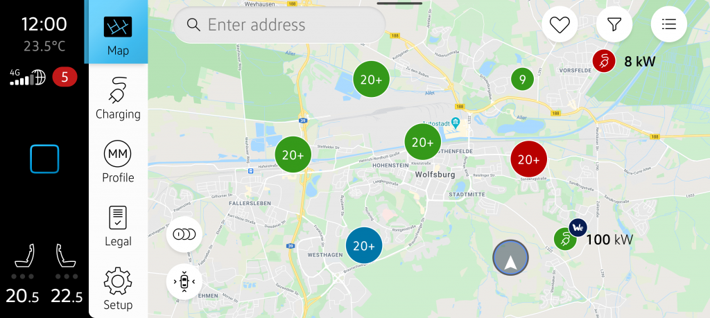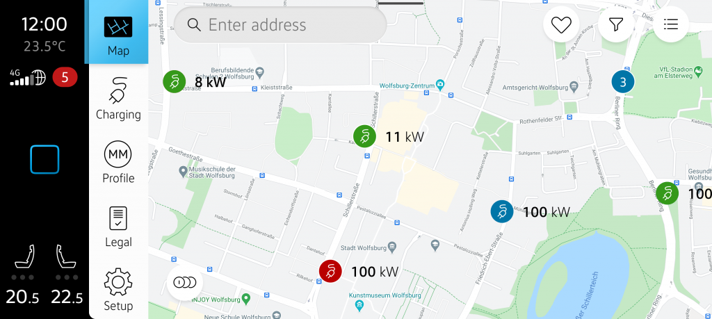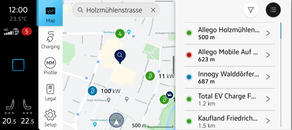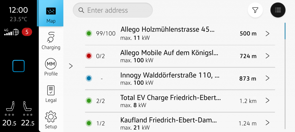 This marks the entry point into the app. There, the map with Charging POIs is displayed. Semantic colors provide information about the status of the charging stations: Green indicates they are available, red signals they are occupied, and blue indicates that no status is available for the charging station. In the upper right corner, there is the option to display charging points in a list. To the left of that, you’ll find the filter and the favorite charging stations. The tab bar on the left allows quick access to the map, charging information, profile, legal details, and settings.