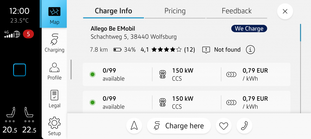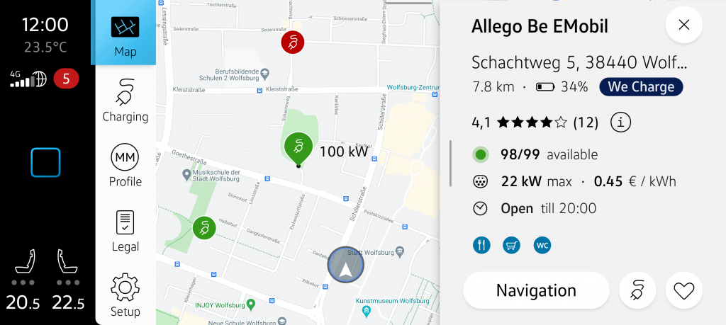 The desired charging point can be easily transferred to the navigation system and navigated to directly or integrated into the route. The We Charge In-Car App also enhances the charging station details in the navigation system. Additionally, the In-Car App allows users to provide feedback and read feedback from other users.