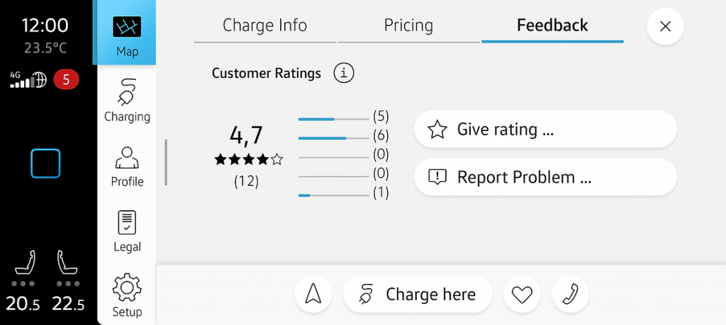 At this point, you have the opportunity to provide a rating or report the charging station in case of complications. Previous ratings provide insights into how other customers have assessed the charging station.