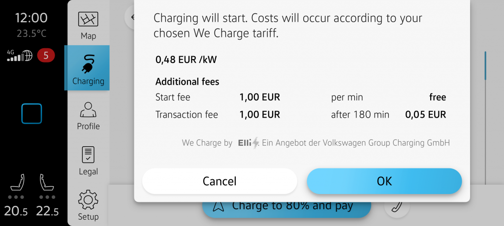 After selecting the appropriate plug, the next step provides an overview of all associated costs before initiating the charging process. This is confirmed by selecting „OK.“