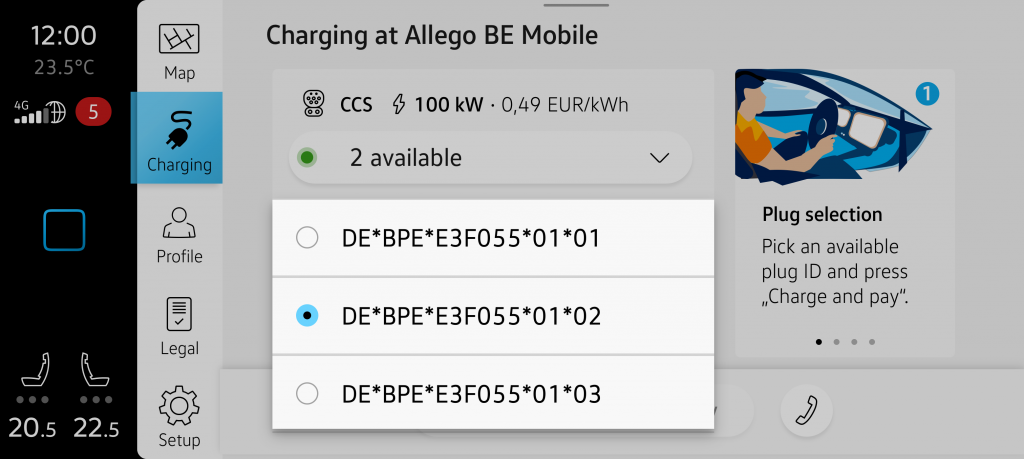 After clicking „Charge here“ on the previous screen, you will be directed to this screen where you can select the plug.